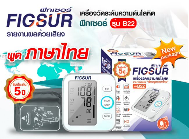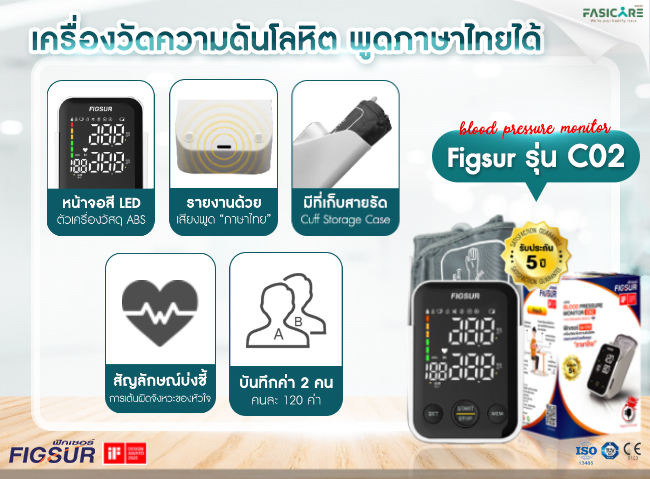 บริษัทฟาซิแคร์ ผู้นำเข้าและจัดจำหน่าย เครื่องวัดความดัน FIGSUR ฟิกเซอร์ เครื่องวัดความดันโลหิตรายงานผลด้วย เสียงพูดภาษาไทย ตัดปัญหาความกังวลในการอ่านค่าด้วยตนเองเป็นเสียงพูด โดยอ้างอิงระดับความดันตาม WHO หรือองค์การอนามัยโลก เหมาะสำหรับผู้ที่เป็นโรค ความดันสูง เพราะครบด้วยฟังก์ชั่นการใช้งานที่หลากหลาย กับ 9 คุณสมบัติเด่น ทั้งยังได้รับเครื่องหมายรับรองมาตรฐาน CE0123 , ISO13485 การันตีคุณภาพ ระดับสากล มีการจัดจำหน่ายในหลากหลายประเทศ อาทิเช่น ประเทศสหรัฐอเมริกา อังกฤษ โปแลนด์ มาเลเซีย เป็นต้น