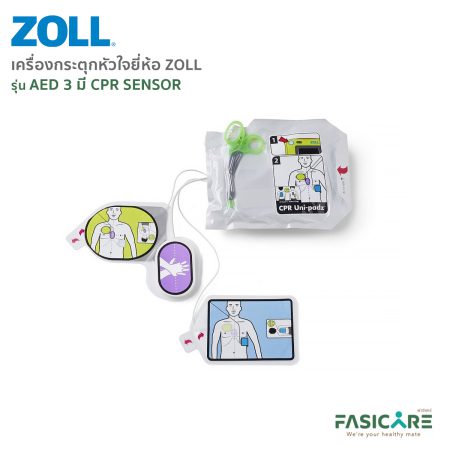 เครื่องกระตุกหัวใจยี่ห้อ ZOLL รุ่น AED 3 ประกอบด้วยแผ่นนำไฟฟ้าแบบมี CPR SENSOR